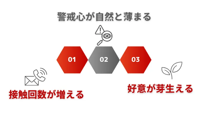 ザイアンス効果(単純接触効果)とは、接触回数が増えることで相手の警戒心が自然と薄れ、好意が芽生えやすくなる心理法則です。