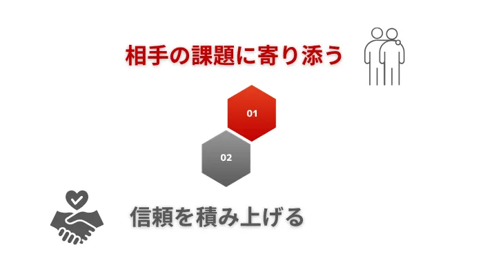 信頼関係は説得ではなく、繰り返しの“接点”から生まれるもの。だからこそ、無理に売り込まず、自然に会う回数を重ねることで“断られにくい”状態がつくれます。