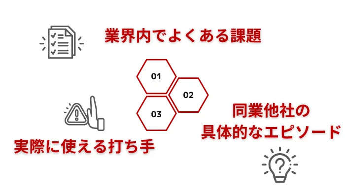このトークのポイントは、「業界内でよくある課題」→「同業他社の具体的なエピソード」→「実際に使える打ち手」の順で話すこと。代表が「この人は表層ではなく、構造をわかっている」と認識してくれれば、会話の主導権をこちらが握れます。
