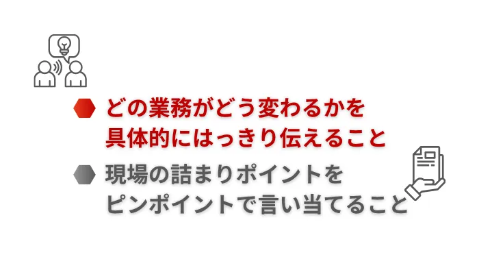 このトークの要は、「現場の詰まりポイントをピンポイントで言い当てること」。効果の実感が早い領域から伝えると、相手の関心がグッと高まります。