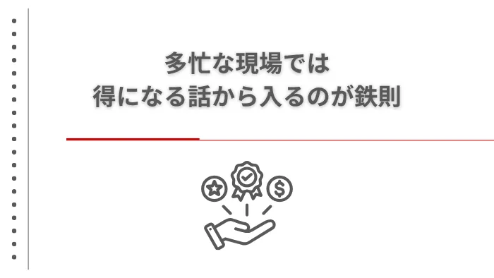 このトークのキモは、「数字×業務名×変化後の状態」。忙しすぎる現場こそ、“その場で得になる話”から入るのが鉄則です。