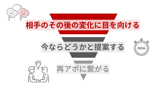失注で終わったと思いがちな商談こそ、“その後の変化”に目を向けると再提案のきっかけになります。たとえば、社内体制の変化や競合ツールの不満、事業フェーズの変化など、小さな変化が再接点のチャンスに変わります。重要なのは「以前の話を踏まえて」「今ならどうか」と前向きに提案することです。相手の変化を自然に引き出すフレーズを入れると、ぐっと再アポ率が上がります。
