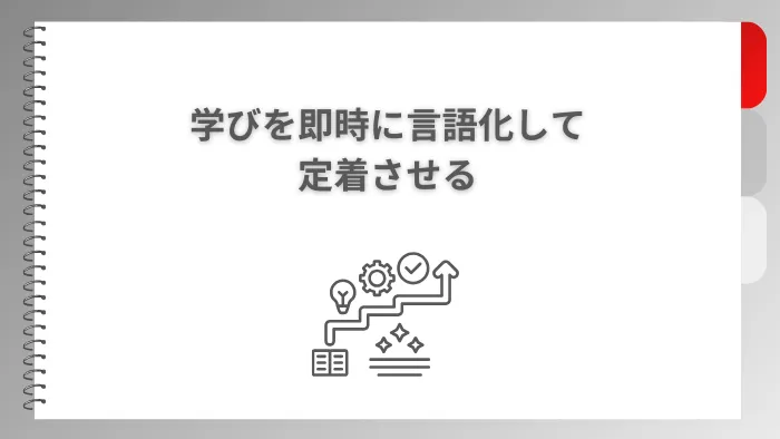 ポイントは、場数を積ませるだけでなく、学びを即時に言語化して定着させることです。