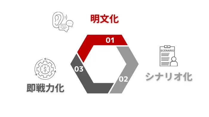 インサイドセールスで成果を安定させるためには、誰が対応しても同じ質で会話できる仕組みが欠かせません。属人化を放置すると、経験者と新人の差が広がり、成果が一部の人に依存してしまいます。そこで業務を型化し、全員が共通の土台で動ける状態を作ることが重要です。