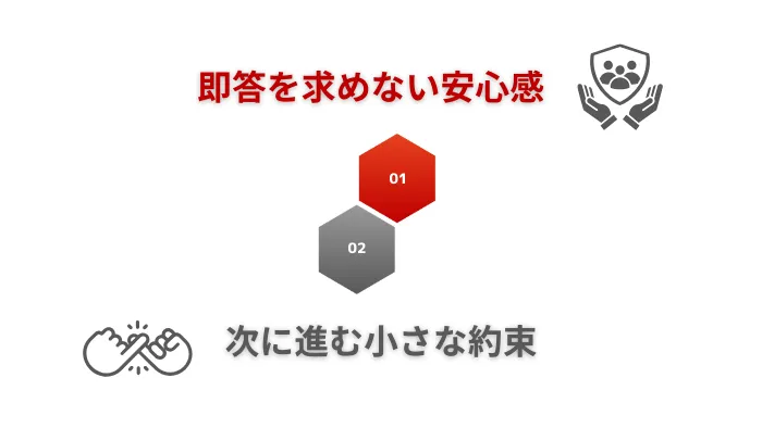 このトークのポイントは、「即答を求めない安心感」と「次に進む小さな約束」を同時に伝えること。お客さまの検討プロセスを尊重しながらも、自然に次の行動を取ってもらえるような設計が信頼関係につながります。