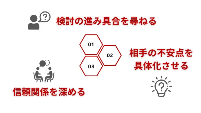 このトークのポイントは、検討の進み具合を尋ねながら相手の不安点を具体化させること。自然な質問を通じて相手の判断基準を明らかにできれば、話の主導権を握りつつ信頼関係も深まります。