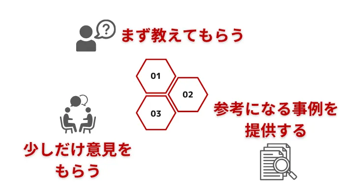 この流れのポイントは、「まず教えてもらう → 参考になる事例を提供する → 少しだけ意見をもらう」という小さな双方向のやり取り。