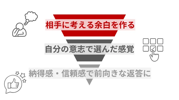 この「沈黙」は、言葉ではなく“間”で背中を押すクロージング技法です。特に「〇〇の効果」など、相手の意思決定に直結する情報を伝えたあとに静けさをつくることで、相手の頭の中で「自分ゴト化」が自然と始まります。