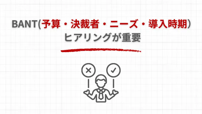 このように「もし導入いただくとしたら…」と仮定形で投げかけることで、ガードを下げながらBANTの4項目を自然にヒアリングできます。