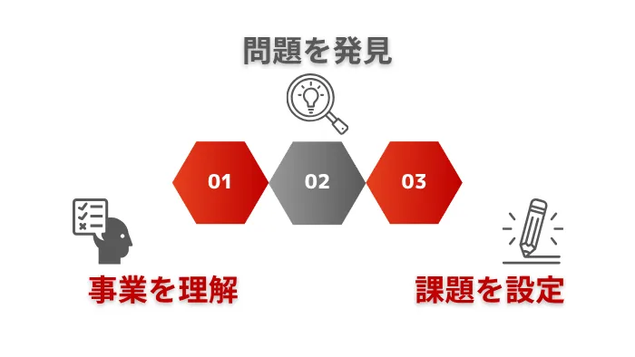 1事業理解のステップ→2問題発見のステップ→3課題設定のステップ