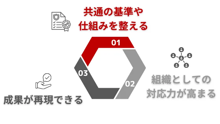共通の基準や仕組みを整えることで、組織としての対応力が高まり、成果が再現できるようになります。