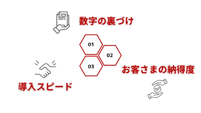 このトークのポイントは、「業務効率化を数字に落とし込む」こと。数字で示された改善幅は、お客さまにとって最も納得感のある判断材料になります。