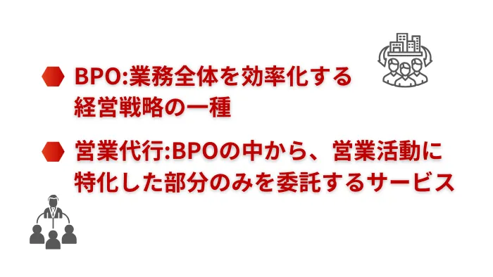 BPOは業務の設計から実行、評価までを含み、営業代行はアポイント獲得や商談など特定の営業業務に特化して売上向上を目指す点が異なります。