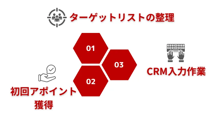 現場では、営業担当が本来注力すべきクロージングや関係構築に専念できるよう、補助的な業務を委託するのが理想です。