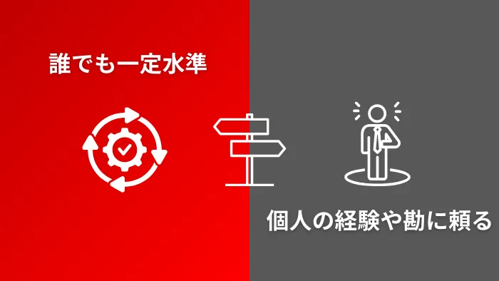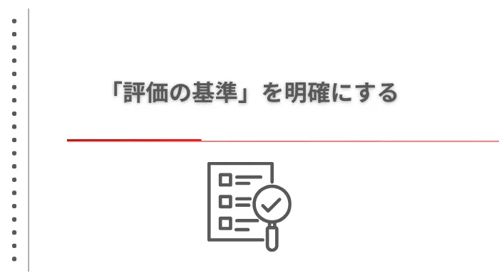 そこで共通の評価基準を設けることで、誰が指導しても同じ視点で改善点を伝えられるのが大きなメリットです。