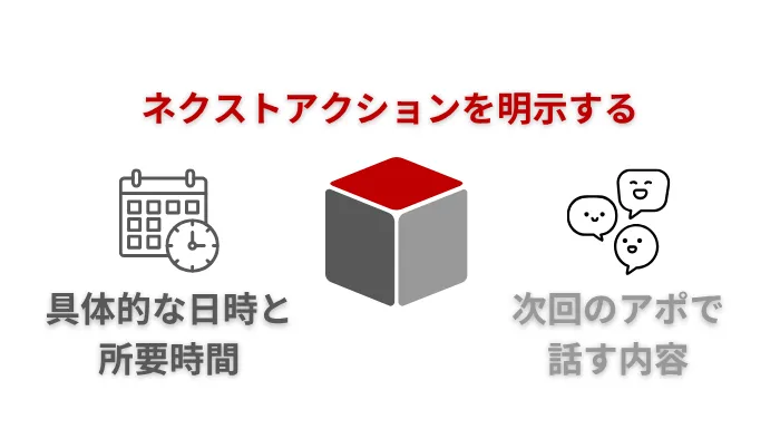 相手が少しでも興味を示した瞬間を逃さず、「じゃあ、いつ動くか」を即提示することでアポ率は劇的に上がります。曖昧な確認ではなく、“日時+内容”を一緒に示すと、相手も答えやすくなります。