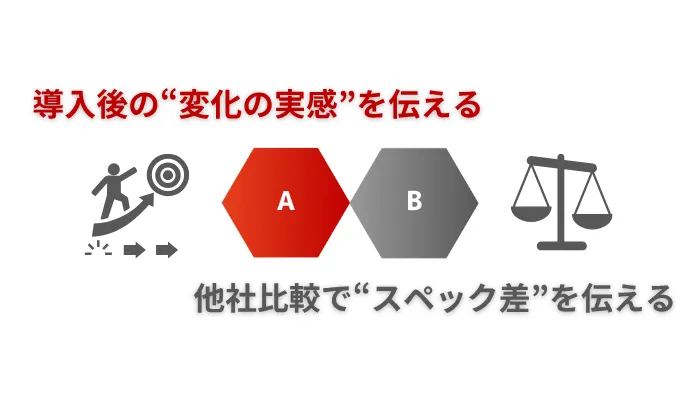 お客さまの頭の中には「で、導入したらどうなるの?」という問いがあります。そこに対し、〇〇というベネフィットを明確に描いてあげることで、導入後の姿がリアルにイメージできます。