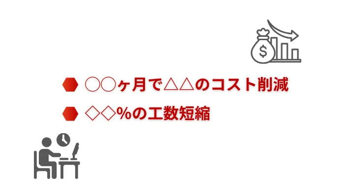 また「◯◯ヶ月で△△改善」「◇◇%のコスト削減」のように時間軸と数値を組み合わせると説得力が増します。