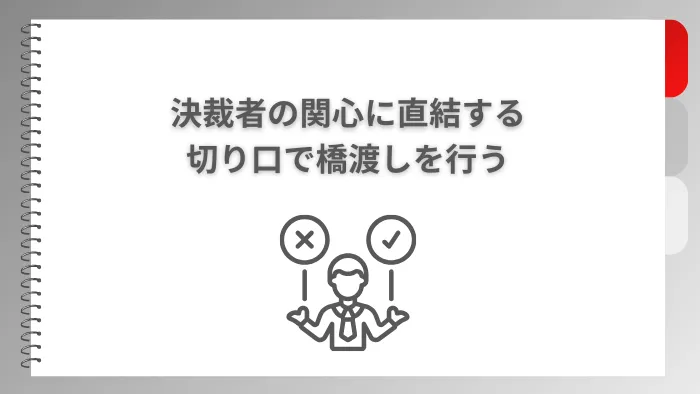 このトークのポイントは、決裁者の関心に直結する切り口で橋渡しを行うことです。